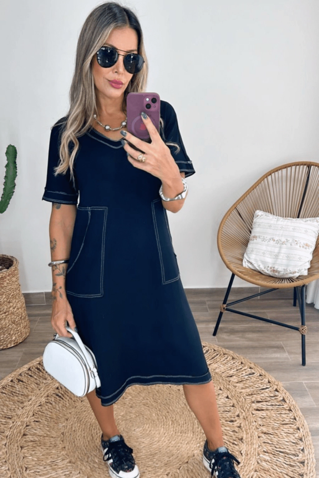 Todo trabalhado no pesponto no Decote V, na manga, barrado e bolsos.